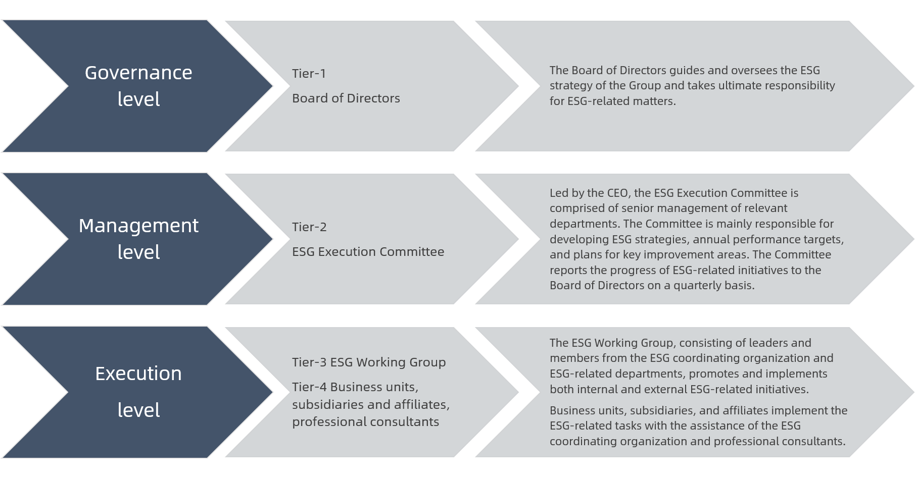 The Group has established an ESG governance structure with the Board of Directors assuming the responsibility and the management taking the lead, enhancing cross-functional cooperation and cross-level collaboration. The Group has incorporated ESG management into its major decisions to promote the high-quality development of the enterprise. The Board of Directors serves as the highest decision-making body for the Group's ESG matters, being responsible for providing comprehensive guidance and supervision over ESG initiatives, and for ensuring the effectiveness of the ESG management processes to support the continuous optimization and improvement of the ESG performance.