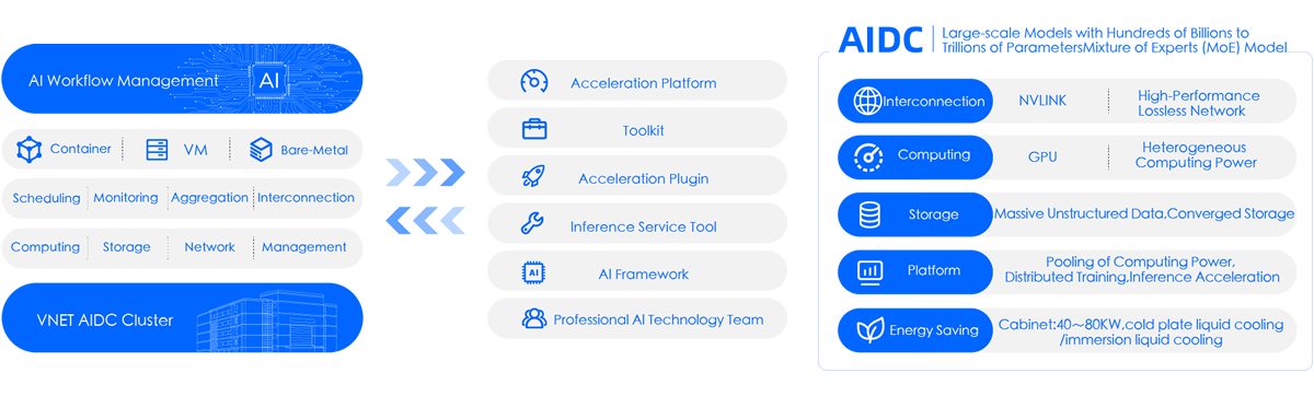 Artificial intelligence has achieved rapid development through significant breakthroughs in neural networks, deep learning frameworks, and algorithm optimization. For large language models and Mixture of Experts (MoE) models with ultra-large numbers of parameters, key processes such as data preprocessing, model training and fine-tuning, and model inference all require efficient parallel computing capabilities, extremely high GPU interconnect bandwidth, and low-latency support for video memory and networks. The GPU computing cluster of VNET, consisting of thousands of mainstream high-performance computing units, possesses significant advantages in the field of intelligent computing.