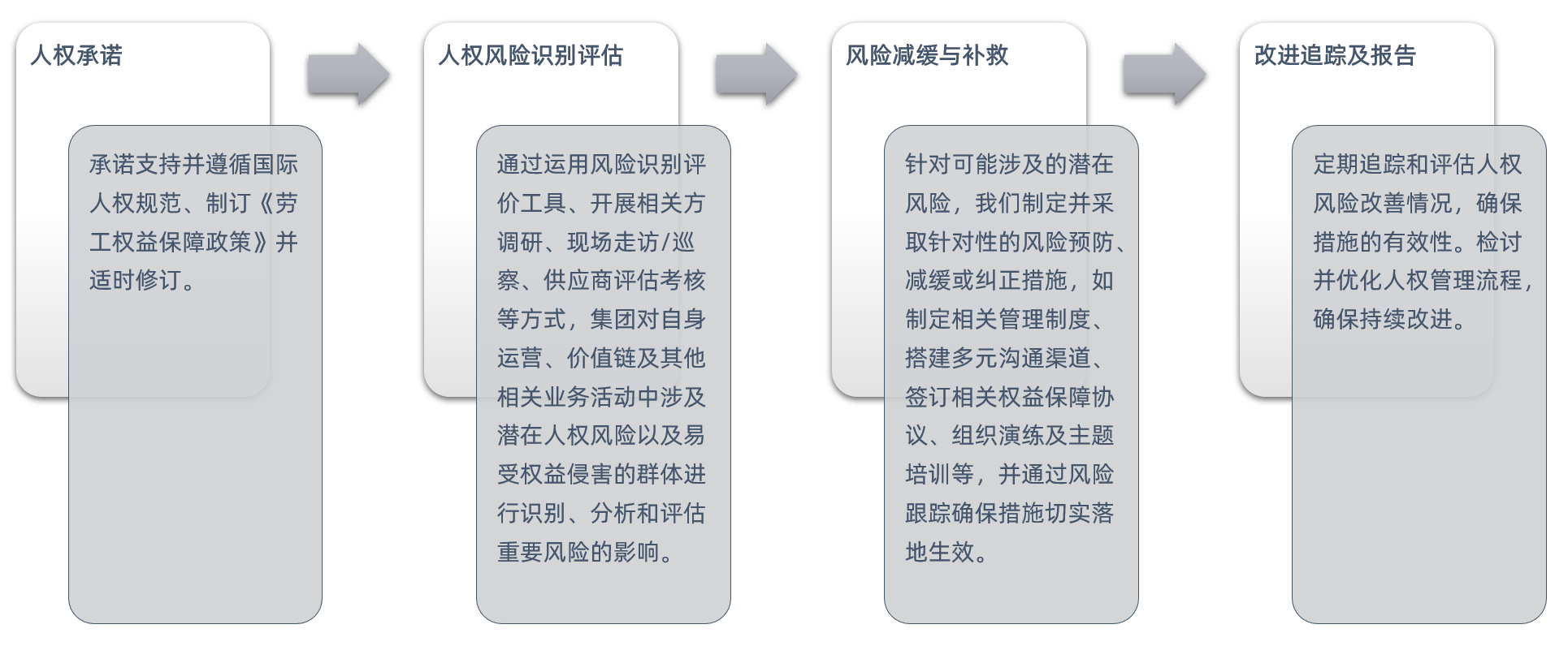 集團制定并發布《勞工權益保障政策》,明確了人權風險識別及管理流程,并對申訴和糾正程序進行規范,旨在全面保障勞工的各項權益。集團制定人權盡職調查流程,具體包括人權承諾、人權風險識別評估、風險減緩與補救措施、改進跟蹤及報告四個步驟。本年度,世紀互聯未出現歧視、騷擾、強迫勞工和雇用童工等情形。